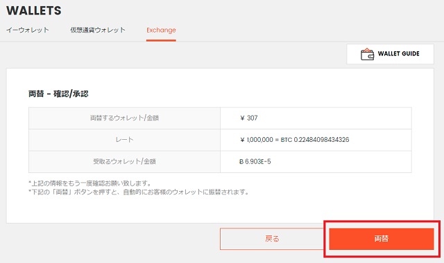 「両替 – 確認 / 承認」で、両替する金額や両替レートを確認し、問題がなければ最後に「両替」をクリックしましょう。