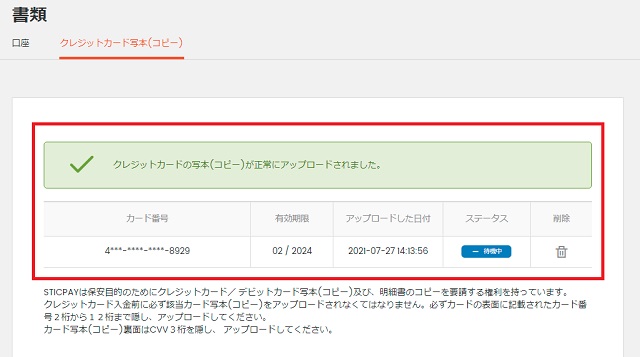 「次へ」をクリックしたらクレジットカード登録手続きは完了です。同画面に「クレジットカードの写本(コピー)が正常にアップロードされました。」と表示され、書類のステータスが「待機中」となります。