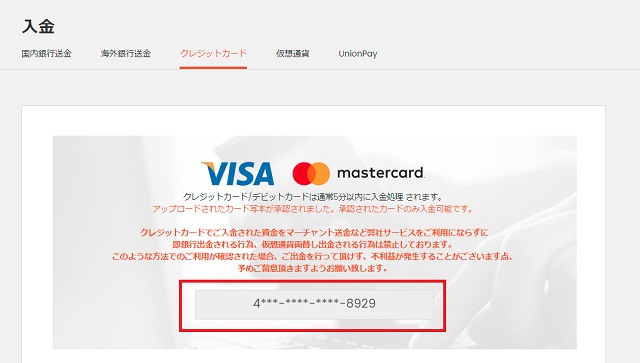 クレジットカード入金画面で以下のように使用可能なクレジットカード番号が表示されます。