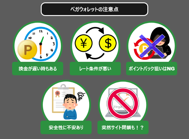 ここまでベガウォレットのメリットや使い方について解説してきましたが、実際にベガウォレットを利用する際は以下5点に注意してください。