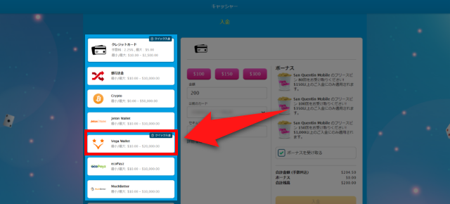 ベガウォレット(Vega Wallet)でのオンラインカジノ入金方法