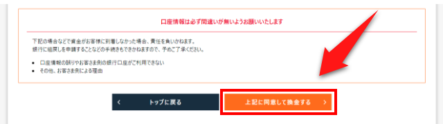 最後に「上記に同意して換金する」をクリックすれば換金(出金)手続き完了です。