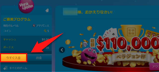 なお、説明ではベラジョンカジノの画像を用いますが、基本的にはどこのオンラインカジノでも手順は同じです。