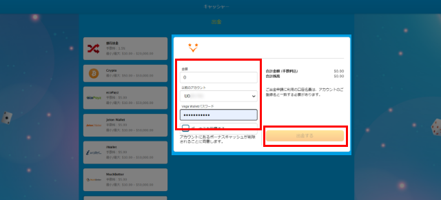 オンラインカジノで勝利金を獲得したら、「出金」メニューをクリックして出金画面を開いてください。