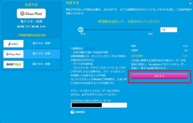 ②出金条件を満たしオンラインカジノからヴィーナスポイントへ入金