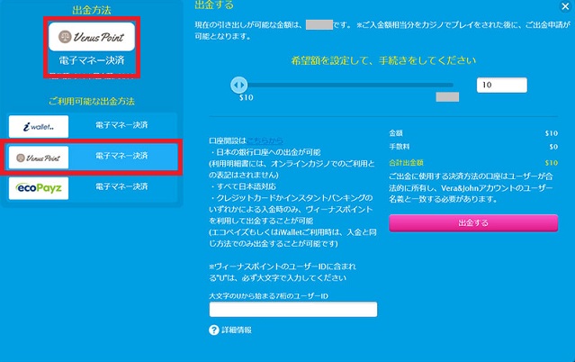 前述した通りの手順で、オンラインカジノからヴィーナスポイントへ入金できれば、反対にヴィーナスポイントからオンラインカジノへ入金できます。