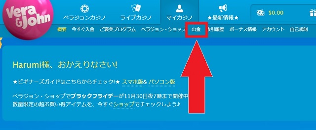 ベラジョンカジノへログインし出金をクリック