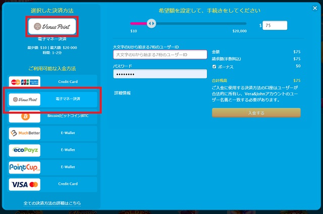 - ヴィーナスポイントからオンラインカジノに入金する方法