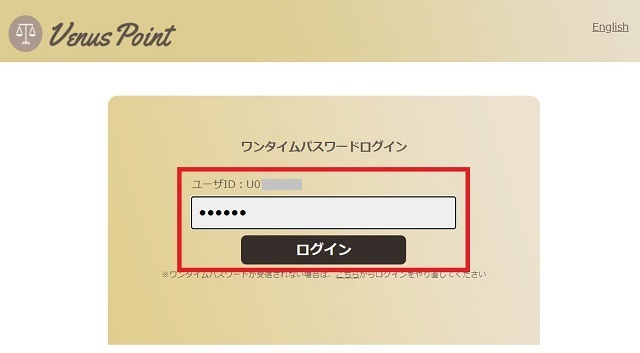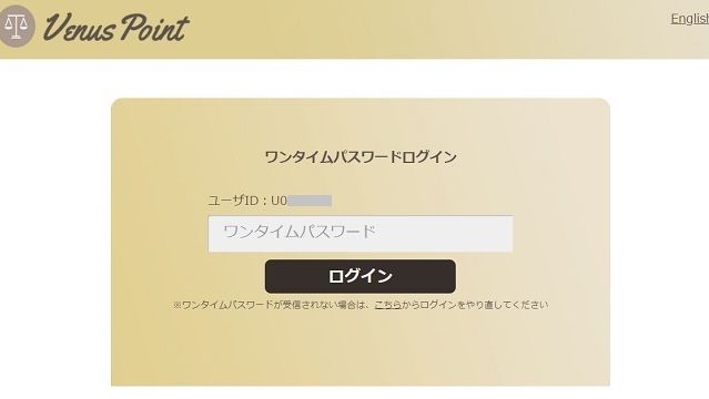 次に、ヴィーナスポイントのワンタイムパスワード画面が表示されます。