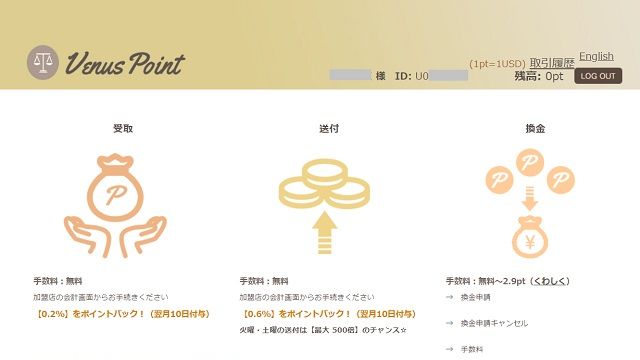 ログインが完了すると、ヴィーナスポイントのアカウントページが表示されます。