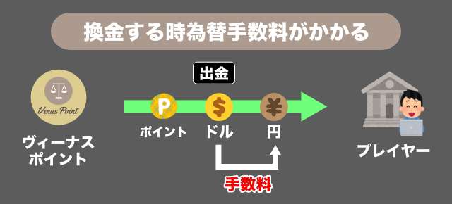 前述した通り、ヴィーナスポイントは「1ポイント=$1」で換算されます。そのため、ヴィーナスポイントから日本の銀行口座に出金する際(ドルから円に換金する際)、為替手数料がかかります。