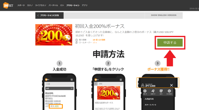 初回入金200%を受け取る方法は簡単です。まずは188BETにログインし、入金手続きを行ってください。入金手続きが完了したら、メニューからプロモーションページを開き、『初回入金200%ボーナス』を選択します。