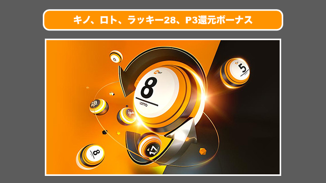 キノ、ロト、ラッキー28、P3にベットした合計金額が還元されるボーナスです。還元率は一律で0.76%で、キャンペーン期間中に1回でも対象ゲームで遊べばボーナスを獲得できます。