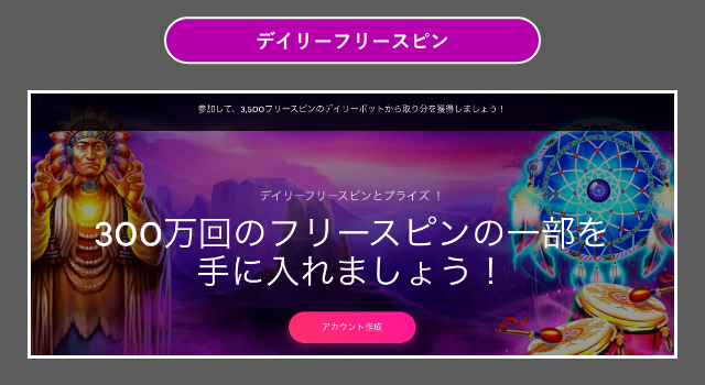 また、まとめて3650回分のフリースピンが獲得できるわけではなく、1日10回分のフリースピンを365日に分けて獲得できます。