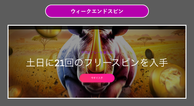 21.comに平日に2回以上入金すると、「ウィークエンドスピン」として週末の土曜日・日曜日に21回ずつ合計42回のフリースピンが進呈されます。