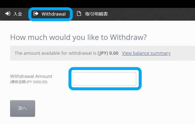 ログイン後、入金画面から「withdrawal」をクリックします。