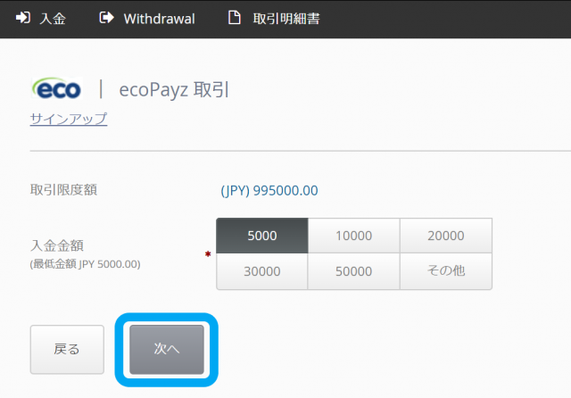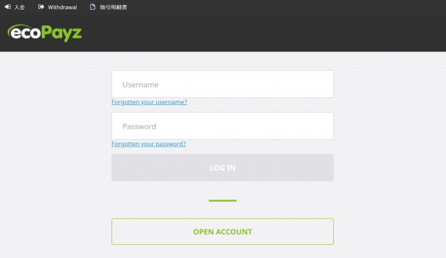 選択した決済サービス(画像はecoPayz)のログインページへ遷移するので、決済情報を入力して入金は完了です。
