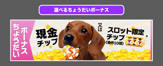 選べるちょうだいボーナスは、毎月16日~翌月1日までの期間で開催されているプロモーションです。現金チップまたはスロット限定チップのどちらかを選んで獲得することができます。