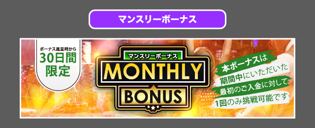 マンスリーボーナスは、その名の通り毎月受け取れるるボーナスです。キャッシュバックやフリースピンなど、ボーナス内容は月ごとに異なります。