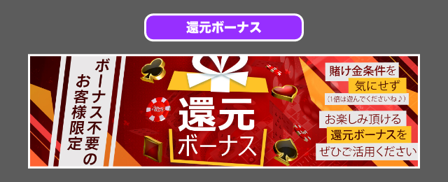 還元ボーナスは、他のボーナスを受け取っていないプレイヤーに向けたキャッシュバックボーナスです。前述したスーパーキャッシュバック同様、最低賭け条件1倍のお得なボーナスなので、とても出金しやすいです。