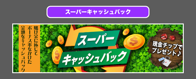 スーパーキャッシュバックは、10日ごとに受け取れるキャッシュバックボーナスです。10日間のトータル収支がマイナスになっているプレイヤーが対象になります。