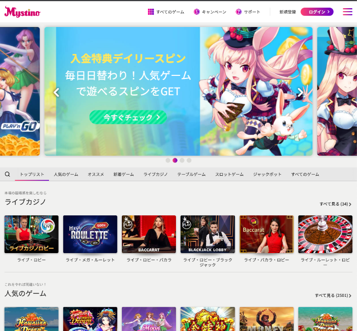 ランキング第3位は2020年創業のミスティーノです。ベラジョンカジノやインターカジノに比べると運営歴はまだまだ浅いですが、ボーナスが現金化しやすいので初心者おすすめオンラインカジノとして選びました。
