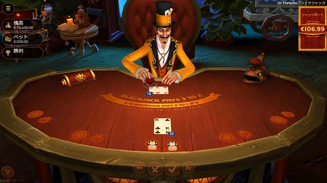 Dr.FortunoBlackjackは怪しい口髭が特徴のDr.Fortuno(ドクターフォーチュノ)がディーラーを務めるブラックジャックゲームです。