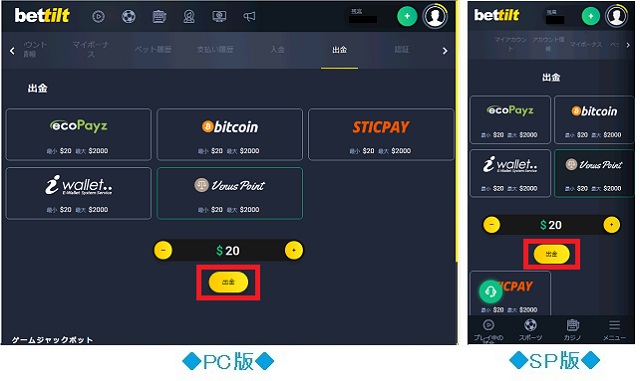 ベットティルトでリアルマネー勝負をするために資金をベットティルトのアカウントに入金する必要があり、ゲームに勝てたら現金をゲットするために出金する必要もあります。