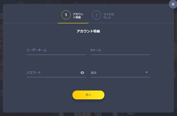まずはユーザー名、パスワード、メールアドレスを入力し、アカウント内通貨を選択します。