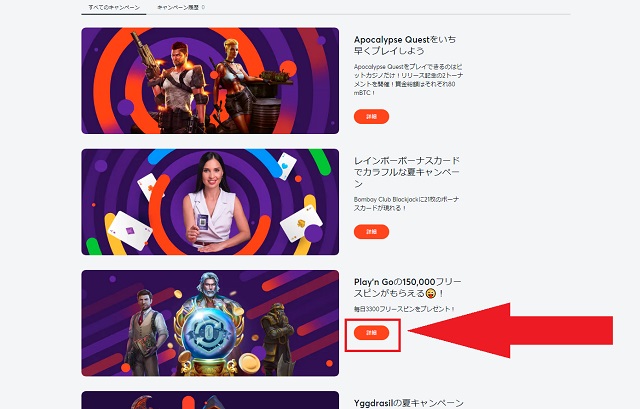 フリースピンボーナスがもらえるキャンペーンは定期的に開催しており、、現在は「Play’n Goの150,000フリースピンがもらえる?!」というキャンペーンをやっています。