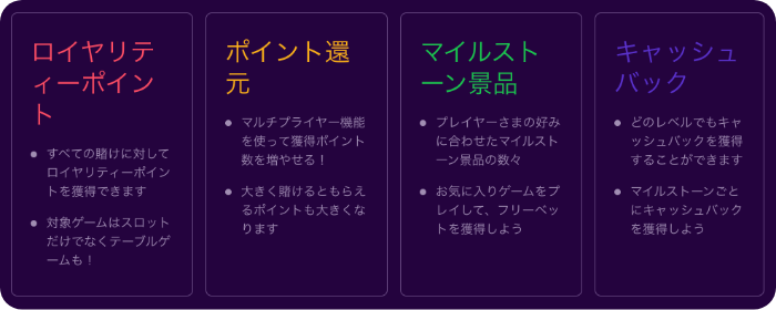 レベルが上がるほどフリースピンやキャッシュバックボーナスなど様々な景品を貰えます。プレイヤーのやりがいを刺激する仕組みがなんとも面白い制度になっています。
