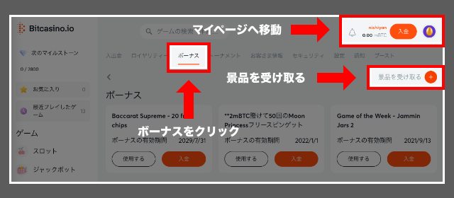 獲得方法は、ビットカジノに登録後、「マイページ」⇒「ボーナス」⇒「景品を受け取る」をクリックしてください。