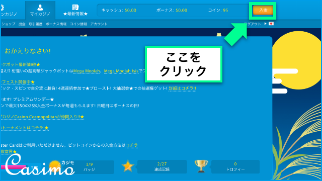 ベラジョンカジノのヘッダーメニューにある『入金』をクリックしてください。