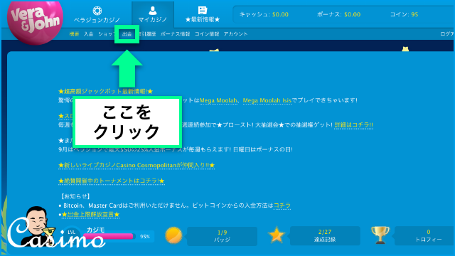ベラジョンカジノの出金方法ですが、「マイカジノ」のページへと移動してください。そして、「出金」をクリックします。