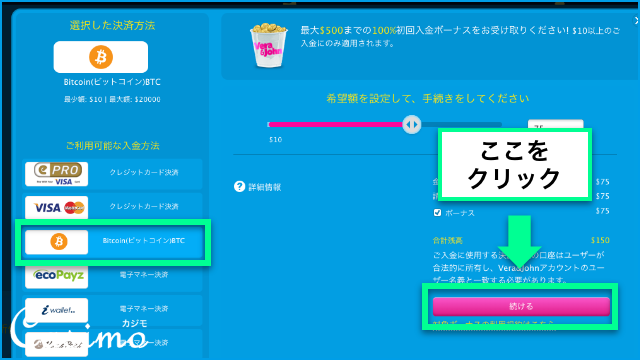 - 仮想通貨での入出金方法(例:ベラジョンカジノ)