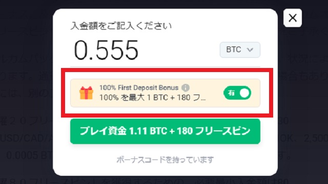 フリースピンを獲得するには、初回入金時に最低0.80 mBTC以上必要です。法定通貨入金の場合は2,000円以上入金すればフリースピンとボーナス両方獲得できます。