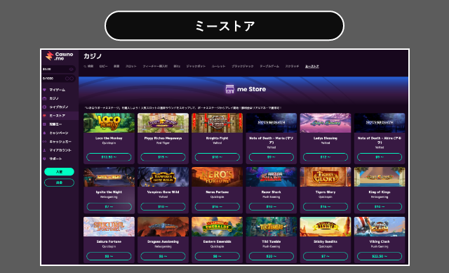カジノミー内の「ミーストア」では、様々なスロットのボーナスを購入できます。