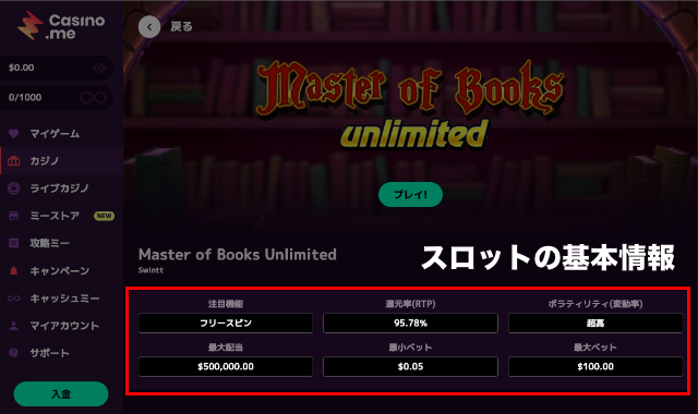 基本情報でチェックできるのは「注目機能」「還元率(RTP)」「ボラティリティ」「ベットリミット」です。遊んでみないとわからない情報が一目で分かるので、調べる手間が省けます。