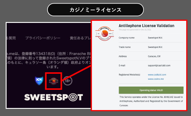 カジノミーはオランダ領キュラソー政府が認可する「Antillephone」ライセンスのもと、合法的に運営されているオンラインカジノです。運営会社SweetspotN.Vはオランダ領キュラソーに登録しています。