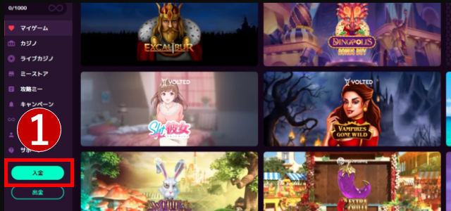 カジノミーにログインしたら、画面左側のメニュー下にある「入金」をクリックしましょう。