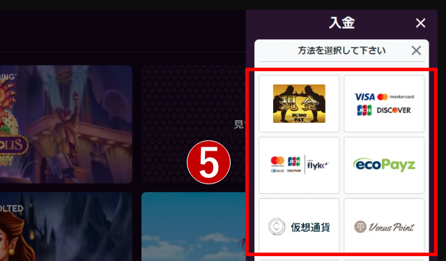 「入金」をクリックすると、入金に使用できる決済方法が表示されます。使用したい決済方法をクリックし、入金手続きを進めましょう。