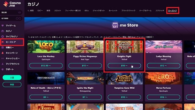 カジノミーにはボーナスが購入できる「ミーストア」と呼ばれるショップが存在します。ミーストアで購入できるボーナスは「いきなりボーナスステージ」のみで、使用するとスロットの通常ラウンドを省略してボーナスステージ(フリースピン)からプレイできます。