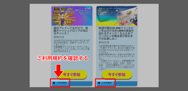 必ず各ボーナスの利用規約で獲得方法をご確認ください。利用規約は各イベント・キャンペーン紹介文下側にある「ご利用規約」で確認できます。