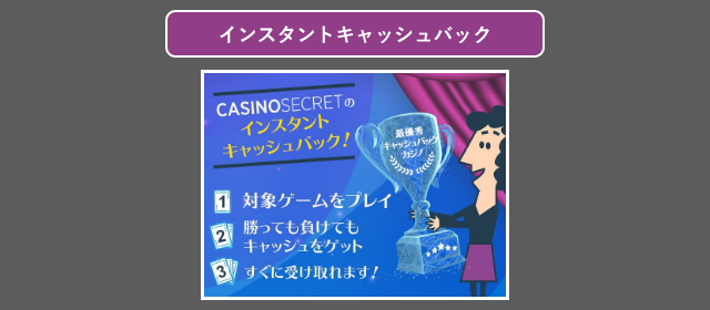 カジノシークレットで貰えるキャッシュバックボーナスは「初回入金キャッシュバック」と「インスタントキャッシュバック」です。