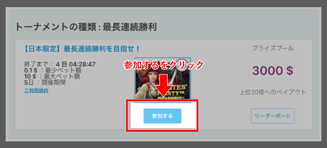 日本人限定トーナメントに参加したい場合は、ヘッダーメニューにある「トーナメント」をクリックし、参加希望のトーナメントの「参加する」ボタンをクリックしてください。
