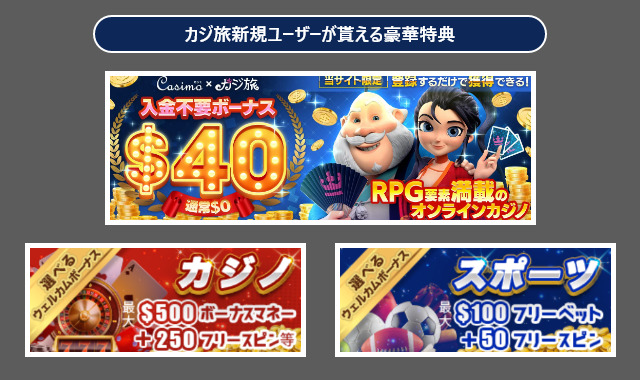 カジ旅では新規プレイヤー向けの限定特典として、下記ボーナスをプレゼントしています。