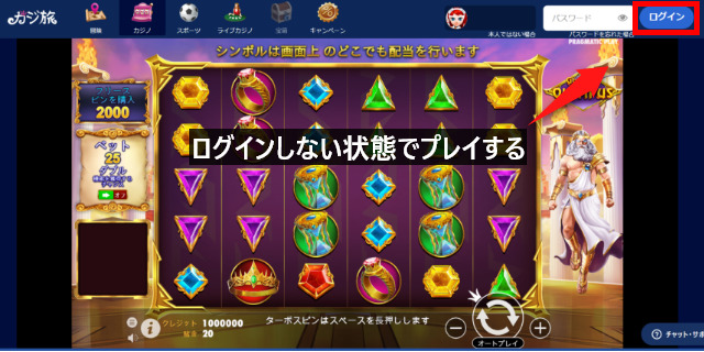 カジ旅はログインしない状態であれば、無料モードでカジノゲームを遊ぶことがで きます。