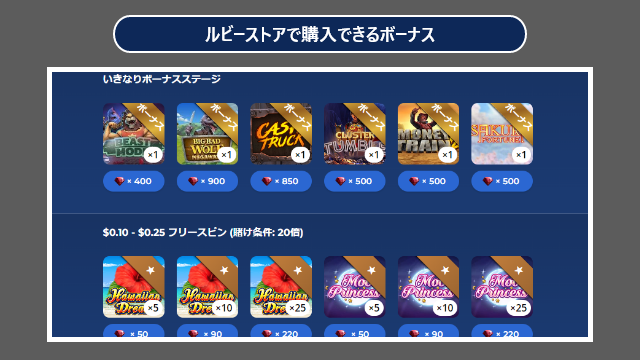 カジノゲームで遊ぶとルビーが貯まり、貯まったルビーはルビーショップで主に人気機種のフリースピンと交換できます。