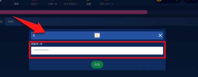 ログインページ上部のコイン残高部分をクリックし、「ご出金」をクリックしてください。