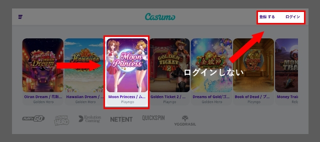 カスモはカジノゲームのスロット、テーブルゲームなら無料プレイ可能です。ログインしない状態で「無料で試す」をクリックすれば、無料モードで起動します。
